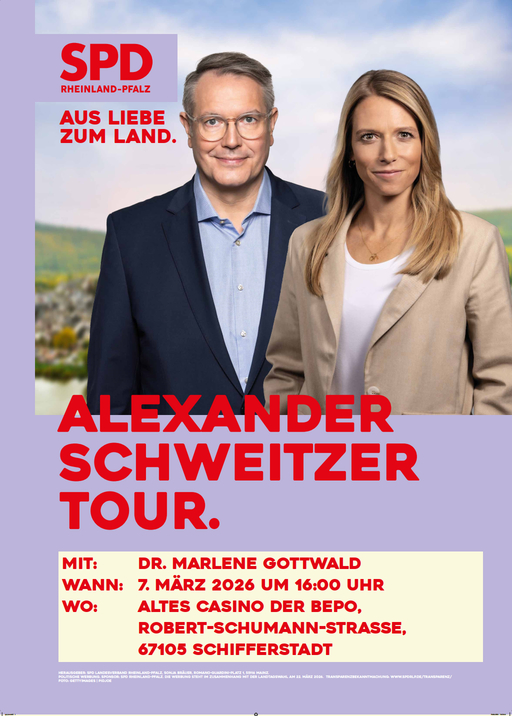 Bis zur Landtagswahl am 22. März 2026 wird der SPD-Spitzenkandidat, Alexander Schweitzer, im Rahmen der „Alexander Schweitzer Tour“ an insgesamt 40 Orten in Rheinland-Pfalz unterwegs sein. Gemeinsam mit der Direktkandidatin des Wahlkreises 39 Speyer – Schifferstadt – Verbandsgemeinde Römerberg-Dudenhofen wird er mit Bürgerinnen und Bürgern ins Gespräch kommen und seine Vorstellungen für die Zukunft unseres Landes vorstellen.